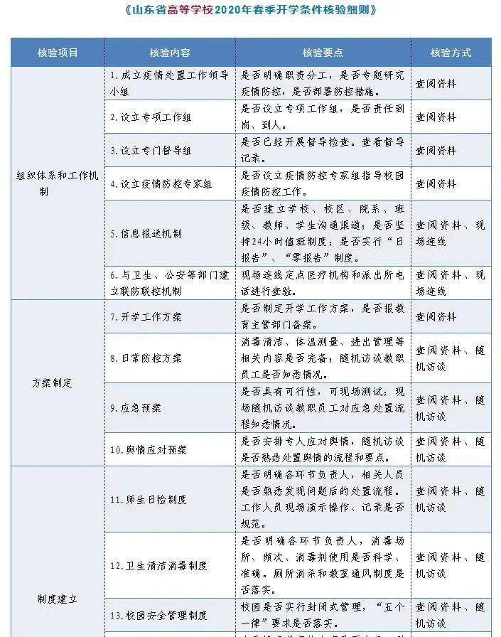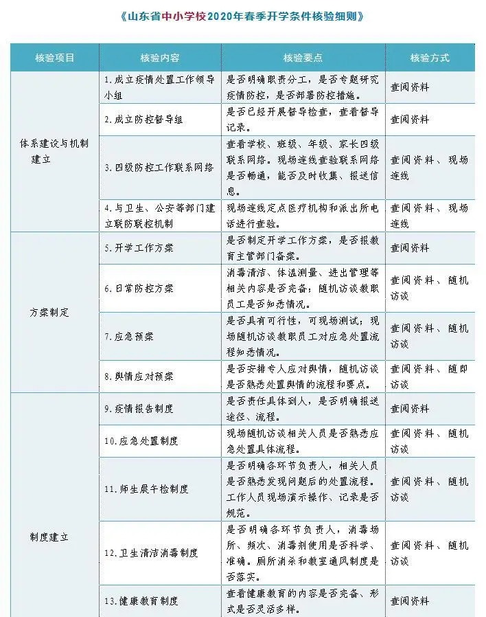 山東省為保障開學(xué)安全,制訂了精細(xì)的核驗(yàn)標(biāo)準(zhǔn),省教育廳聯(lián)合衛(wèi)生健康部門以及市場(chǎng)監(jiān)督管理部門,一同頒布了中小學(xué)與高校的春季開學(xué)條件核驗(yàn)細(xì)則,該細(xì)則包含了組織體系、物資保障、消毒清潔等眾多具體項(xiàng)目。