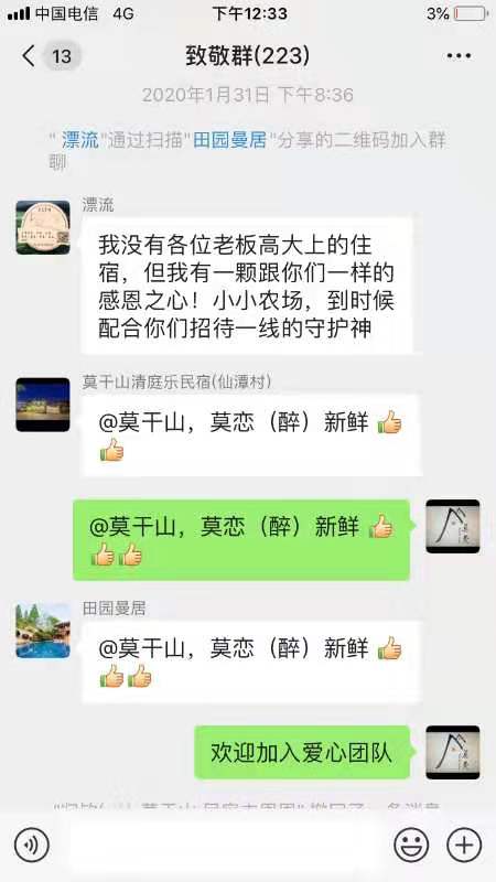 大年三十,各地出現(xiàn)了醫(yī)護(hù)人員逆行援鄂的新聞,莫干山的民宿主們看到這樣的新聞后,深受感動。隨后,他們迅速建立了“致敬”群,以“家”的名義發(fā)出倡議,要在疫情結(jié)束后,邀請醫(yī)護(hù)人員及其家人前來補(bǔ)過春節(jié),并且享用一頓遲來的團(tuán)圓飯。此倡議發(fā)出之后,近300家民宿動作迅速地響應(yīng)了,這些民宿表示,愿意提供免費(fèi)住宿或者餐飲服務(wù)。