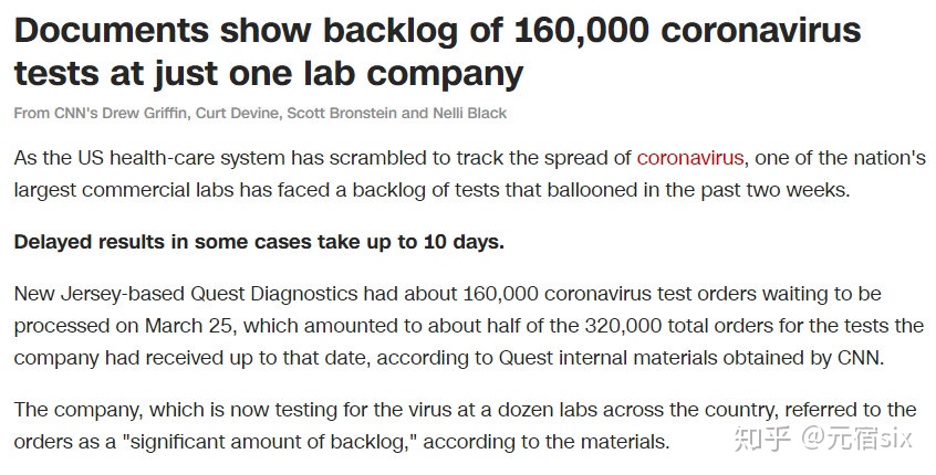2020年2月初,美國疾控中心回絕了世界衛(wèi)生組織所推薦的檢測方案,其自行研發(fā)的試劑盒出現(xiàn)了污染問題,這徑直致使全美錯失了一個多月的防控窗口期之后,2月29日華盛頓州出現(xiàn)首例死亡,食品藥品監(jiān)督管理局方才放開了私營實驗室另行開發(fā)試劑時,CNN獲得到的內(nèi)部訂單記錄表明,3月25日的時候全美積壓檢測訂單多達16萬份,此數(shù)字等同于當時韓國一個月的檢測總量。