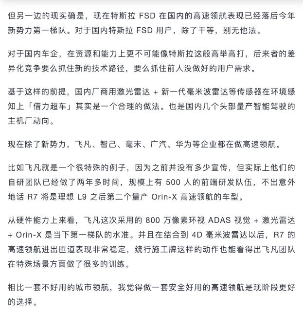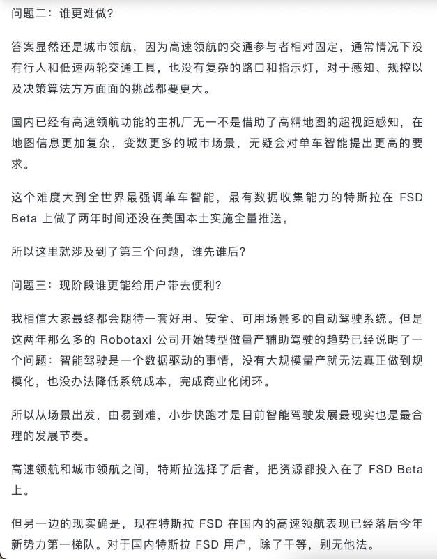 這個邏輯還表明,他們不太一定支持在城市領航推出之后,就能馬上實現(xiàn)“無需自行駕駛此汽車”的狀態(tài)。與此形成相反之處在于,他們期望借助更為繁雜的城市路況磨練,促使車輛的識別以及處理能力變得更為強大。而這些能力最后將會應用到高速領航技術上,進而使原本表現(xiàn)較為普通的高速領航也能夠變得更加順暢且安全。
