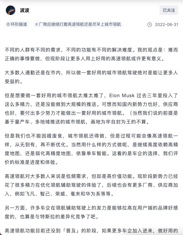 高速領航當下是現(xiàn)今變得愈加那般成熟起來了,然而城市領航不過是適才剛剛起好步。一套并非是熟透狀況的城市領航效用不但根本就沒辦法為用戶帶去那么些易于使用的便利之處,反而還會白白地增添諸多麻煩困擾。畢竟能夠使用跟好用這兩者完全是屬于兩碼事的情形,絕對不可以為了推進進度而舍棄了質(zhì)量的把控,首先應把現(xiàn)有的高速領航優(yōu)化到那種極其完善至高無上的程度才算是最為要緊的正事。