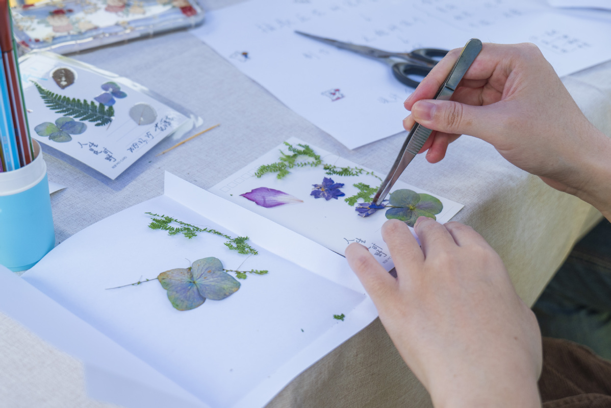 壓花體驗(yàn)園的角落里,有個女生,她對著剛制成的作品,靜靜地默默流淚。志愿者并未上前去打擾,僅僅是悄悄地在她身旁放了一包紙巾。后來,女生主動講了,她把想要對已經(jīng)去世的外婆說的話語,寫在了壓花的背面,完成之后,忽然感覺外婆似乎收到了。這種沒有聲音的療愈,在草坪上的很多角落,同時正在發(fā)生著。