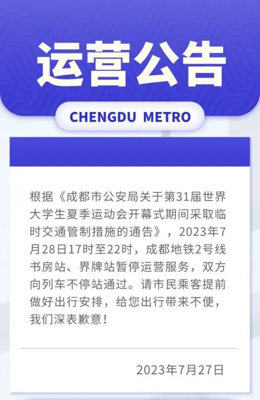7月28日晚間五點(diǎn)至十點(diǎn),此即大運(yùn)會(huì)開幕式舉行之時(shí),地鐵二號(hào)線的書房站以及界牌站將會(huì)臨時(shí)性關(guān)閉。于這兩個(gè)站點(diǎn),列車不會(huì)駐車,而是徑直通過,乘客不得進(jìn)行上下車操作。