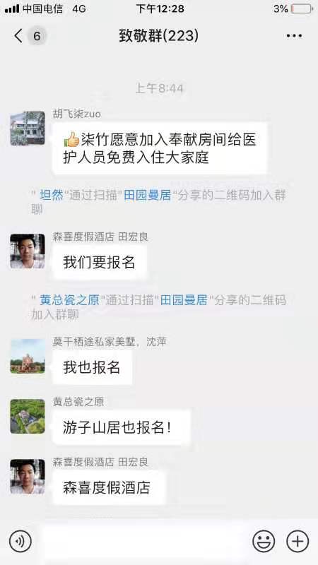常常是,大家入群之后的頭一句話便是“我要報名”。哪怕是那些沒辦法提供房間的業(yè)主,也做出保證會盡力去籌備餐飲事宜。有一個自發(fā)開展的行動,啟始于莫干山那兒,期望在將來能夠吸引到全國范圍內(nèi)更多的民宿參與進(jìn)來,從而把這份善意施惠于每一位在一線拼搏奮戰(zhàn)的醫(yī)護(hù)人員。