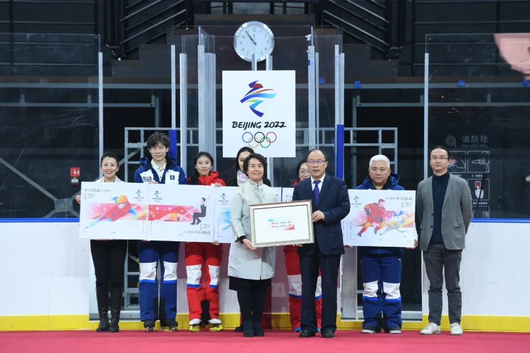 中國郵政集團(tuán)有限公司的副總經(jīng)理康寧,把編號為2022A的紀(jì)念郵票版式二贈(zèng)送給北京冬奧組委,由專職副主席韓子榮接收并作為永久珍藏。這套郵票共有5枚,包含了短道速滑、花樣滑冰、速度滑冰、冰壺以及冰球這全部5個(gè)冰上運(yùn)動(dòng)項(xiàng)目,是歷年來枚數(shù)最多的一回。從1966年一直到現(xiàn)在,中國郵政多次發(fā)行冰雪運(yùn)動(dòng)主題的郵票,然而像這樣集中呈現(xiàn)冰上項(xiàng)目還是第一次,5枚相連的版式二設(shè)計(jì)更是開創(chuàng)了同題材郵票的先河。