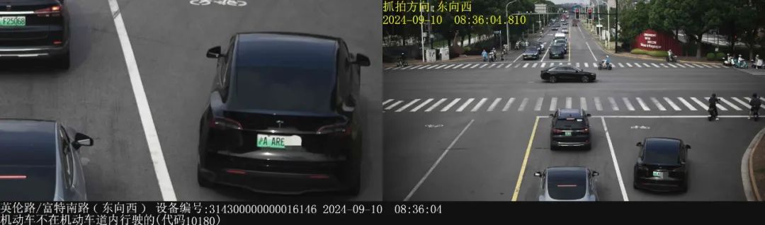 兩天之后,9月12日,下午2點(diǎn)55分,在松江區(qū)文匯路龍騰路路口,滬AEP8的小型轎車,犯下了同樣的錯(cuò)誤。這條路臨近大學(xué)城,學(xué)生出行頻次高,非機(jī)動(dòng)車道原本就繁忙,小轎車這一闖入,即刻造成了局部擁堵,現(xiàn)場(chǎng)執(zhí)勤的交警,當(dāng)場(chǎng)將其攔下。