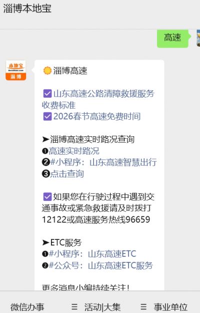 通過(guò)微信進(jìn)行搜索,關(guān)注那個(gè)名為【淄博本地寶】的主體,于對(duì)話框之中回復(fù)【高速】,如此便能夠獲取淄博高速實(shí)時(shí)路況查詢出入口,以及高速救援費(fèi)用收費(fèi)所遵循之標(biāo)準(zhǔn),還有ETC辦理平臺(tái)的入口之處。在出門以前看那么一眼所屬路況,躲開呈現(xiàn)紅色的擁堵路段,這能夠讓你在春節(jié)期間出行變得順暢許多。