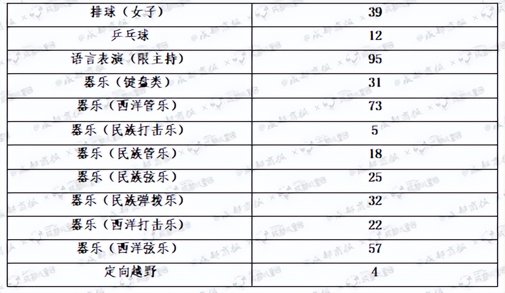 今年,有34所學(xué)校,其具體招生計(jì)劃以及專業(yè)出現(xiàn)了調(diào)整,其中,有的學(xué)校增加了招生的名額,有的學(xué)校對(duì)招收的專業(yè)種類作出了調(diào)整,舉例來說,石室天府招收一名女子壘球特長生,十二中招收三名女子藝術(shù)體操特長生。