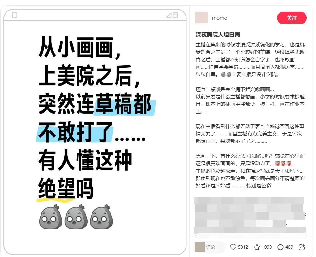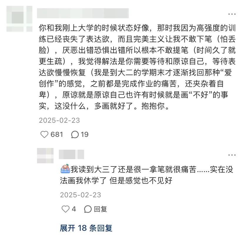 許多藝術生歷經(jīng)集訓的煎熬,成功考進大學,他們認為終于能夠自由開展創(chuàng)作了。然而,在真正坐到空白畫紙跟前時,他們體會到的并非是釋放,而是極為強烈的恐慌。過去的一兩年里,關于“畫成什么樣”的所有決策皆是由考試大綱抉擇的,你從來都未曾被準許去詢問自己想要表達些什么。所以,當外在標準陡然消失后,好多人反倒不清楚該如何動筆。那種自小學畫、因熱愛而持續(xù)堅持的沖動,在經(jīng)過無數(shù)次“應該這樣畫”的灌輸后,已然變得含糊不明了。除掉這等詛咒,如蝴蝶破繭般艱難,需于循規(guī)蹈矩的肌肉記憶里,再度尋回那自由之己。令人遺憾的是,大學四年,似也未提供一足夠安全之空間,讓這些年輕人實現(xiàn)蛻變。