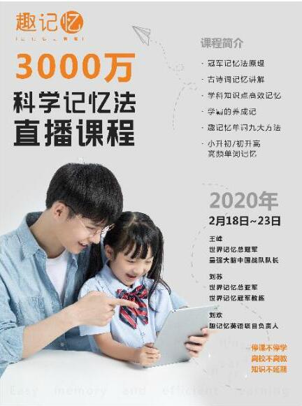 2月18日起,趣記憶面向全國中小學(xué)生推出直播課程,此課程為3000萬科學(xué)記憶法普及直播課程,正式開課了。該課程由世界記憶總冠軍王峰、劉蘇團(tuán)隊(duì)打造,其目標(biāo)清晰明確,旨在助力疫區(qū)及全國孩子在延遲開學(xué)時段實(shí)現(xiàn)高效學(xué)習(xí),進(jìn)而化解家長對于學(xué)習(xí)效果的憂慮。