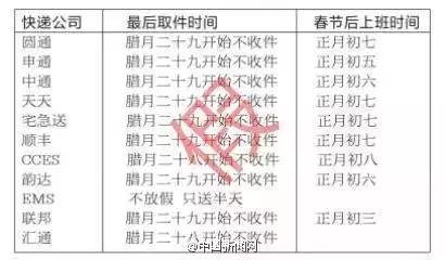 圓通在偏遠(yuǎn)地區(qū)已經(jīng)停止收件,然而江浙滬地區(qū)仍然處于正常攬件狀態(tài)。春節(jié)期間存在人員值班,派送不會(huì)停止,可是具體停止攬件的時(shí)間尚未公布。中通除了新疆、內(nèi)蒙,四川境內(nèi)的甘孜等地區(qū)也停止收件了。匯通的情形較為特別,有網(wǎng)點(diǎn)表示25號(hào)停止收件,有的網(wǎng)點(diǎn)又聲稱(chēng)全年無(wú)休并且尚未接到停運(yùn)通知。
