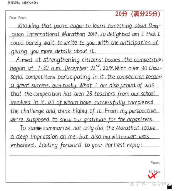 英語作文跟文科主觀題是一樣的情況,卷面是為你的第一張名片。我高一時(shí)候那篇得11分的作文,其內(nèi)容跟后來得22分的作文實(shí)際上不存在本質(zhì)上的差距,最大的變量在于把字從潦草的斜體給換成了衡水體。字體端正的卷子能夠讓閱卷老師在短短幾秒鐘內(nèi)判定這是“認(rèn)真作答”的考生,印象分直接就拉滿了。