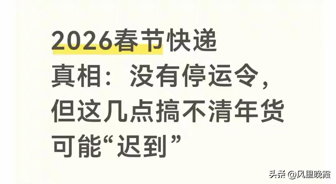 理清了2026春節(jié)快遞安排,不打烊的要加價且會延遲,放假的有明確時間表,偏遠(yuǎn)地區(qū)現(xiàn)在就得寄,核心區(qū)還能拖到2月10號。大家今年準(zhǔn)備選哪家快遞寄年貨呀?最晚打算啥時候下單呢?在評論區(qū)聊聊你的計劃,覺得有用就點贊并轉(zhuǎn)發(fā),讓身邊人都別踏入快遞停運(yùn)的坑。