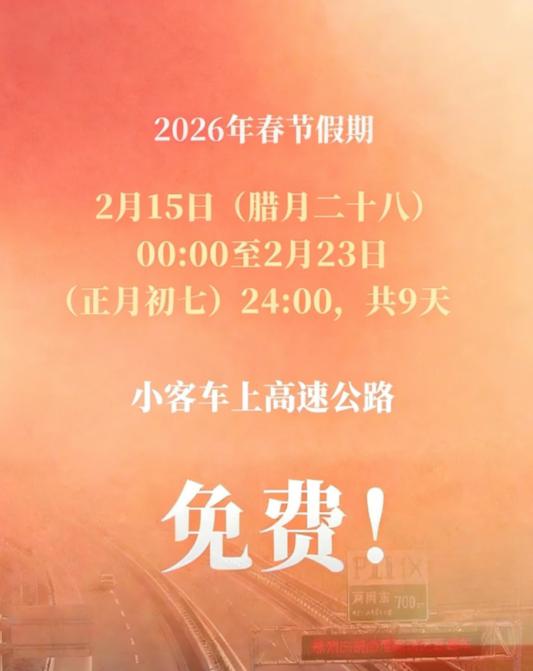 今年春節(jié)期間,高速免費時間從2月15日即臘月二十八零點起算,持續(xù)延至2月23日當(dāng)天正月初七24點,時長整整9天,免費車型遵循以往慣例,7座以及7座以下的小型客車均可享受免費政策。