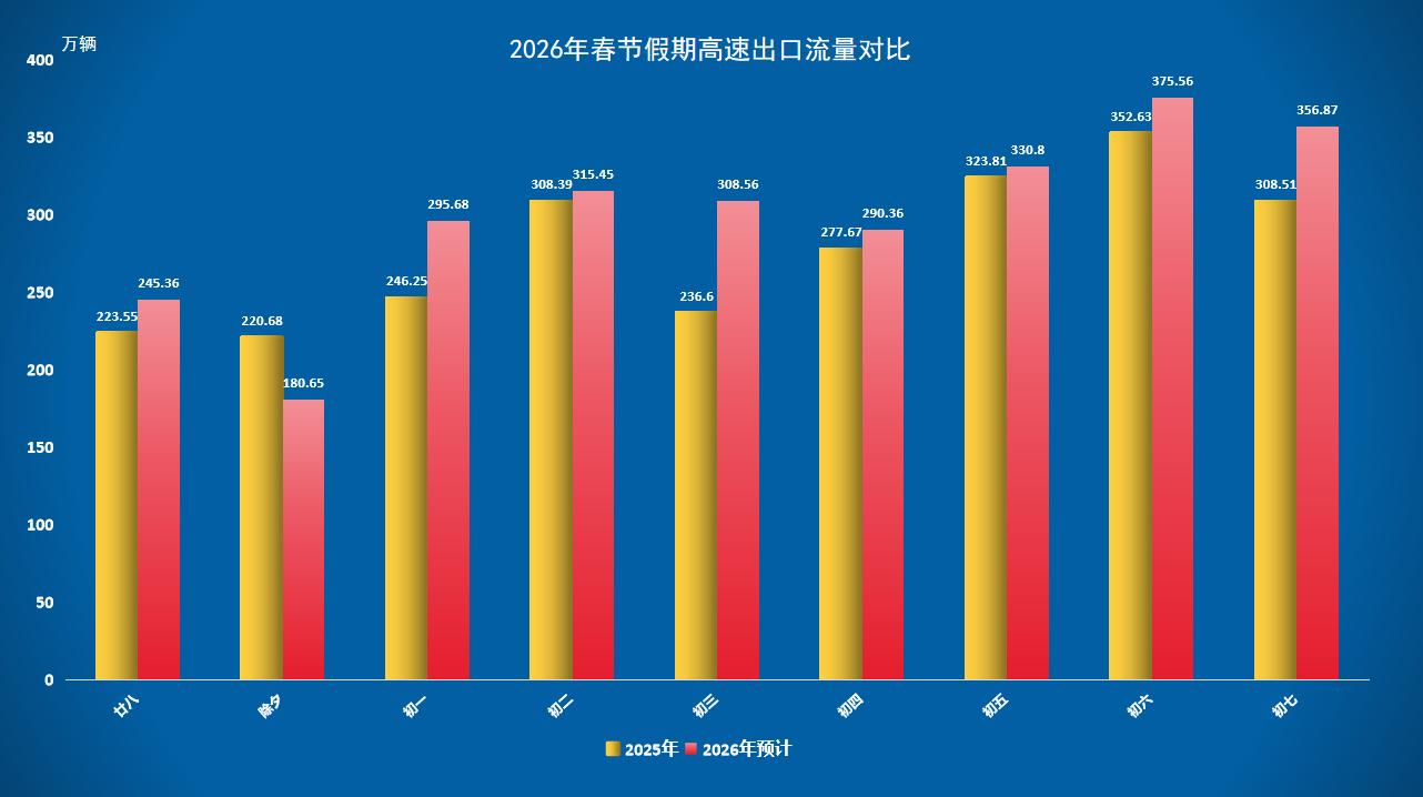 春節(jié)交通展現(xiàn)出節(jié)前呈現(xiàn)集中態(tài)勢,節(jié)中保持平穩(wěn)狀況,節(jié)后出現(xiàn)高峰疊加狀況的特色。臘月二十八時車流量便開始急劇上漲,除夕當(dāng)日鑒于闔家團(tuán)圓的緣故,反而成為假期里車輛最少的一天。正月初一伊始呈現(xiàn)逐步回升態(tài)勢,初四、初五以及初七會存在多輪返程高峰。