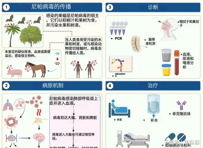 它的傳播方式相當(dāng)繁雜,這種病毒,其天然宿主是果蝠,病毒能夠借由被蝙蝠污染的食物,像椰棗或者水果之類,傳播至人類,除此之外,它還能夠在家畜比如豬當(dāng)中傳播,進(jìn)而致使與這些動物有緊密接觸的人被感染。
