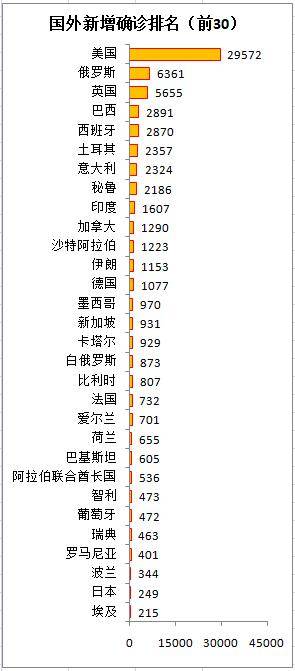 美國(guó)累計(jì)確診數(shù)量達(dá)到了985060例,平均下來(lái)每333個(gè)人當(dāng)中就會(huì)有一個(gè)人感染,自3月23日開(kāi)始直至如今,美國(guó)已經(jīng)連續(xù)35天單日新增確診的數(shù)量突破了一萬(wàn)例,在20天的時(shí)間范圍以?xún)?nèi),確診病例的凈增數(shù)量為62萬(wàn)例,日均的增量超過(guò)了31000例,這個(gè)數(shù)字遠(yuǎn)遠(yuǎn)超過(guò)了其他任何一個(gè)國(guó)家。