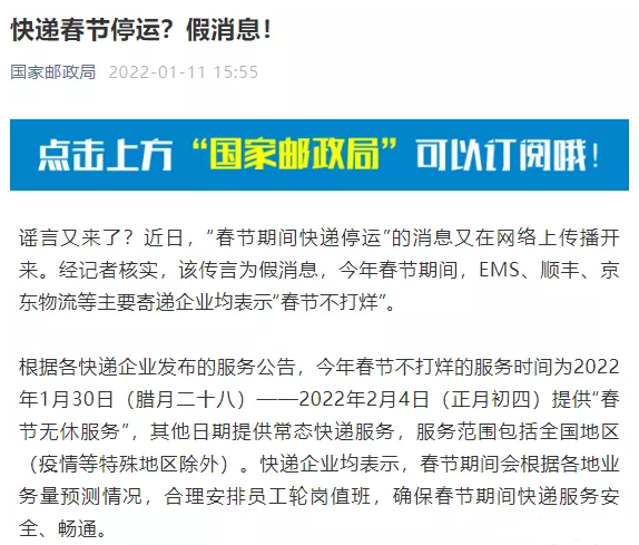 在1月11日的時候,國家郵政局看不下去了,專門發(fā)出了一個緊急辟謠聲明,明確告知大家,“春節(jié)快遞停運(yùn)”是完全徹頭徹尾的假消息。官方都出來進(jìn)行說明表達(dá)了,這事兒算是徹底得到證實(shí)確定了。