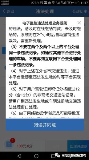 在這特定時(shí)刻,系統(tǒng)會(huì)彈出一個(gè)說明框,這個(gè)框是關(guān)于電子監(jiān)控違法處理業(yè)務(wù)的規(guī)則說明。別嫌麻煩,要快速瀏覽一遍,之后點(diǎn)擊下方的“閱讀并同意”按鈕。