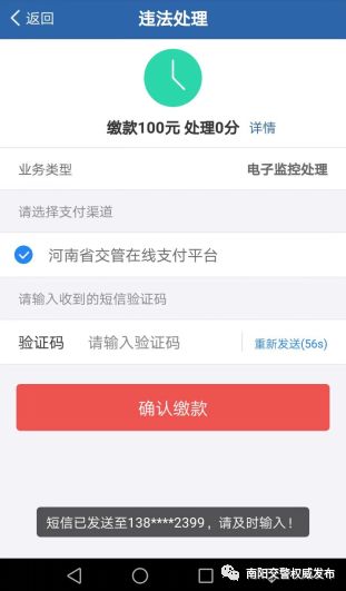 后續(xù)將會(huì)進(jìn)入到違章處理的最終確認(rèn)界面。為確保乃是本人操作系統(tǒng),將會(huì)要求再度輸入手機(jī)短信驗(yàn)證碼,輸入完畢之后點(diǎn)擊“確認(rèn)繳款”按鈕。